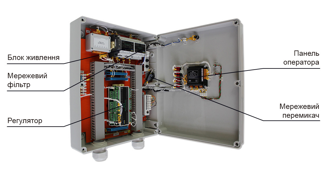 Контролер АКС складається з регулятора на DIN рейці, встановленого всередині пластикового щита та панелі оператора з TFT дисплеєм на лицьовій частині.