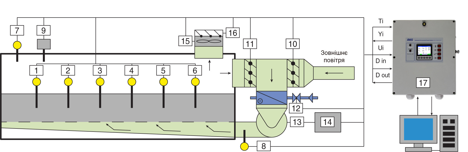 Застосовується для керування процесом заростання компосту в тунелях та камерах (фаза III). Контролер управляє